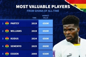 加纳球员历史身价榜:托马斯、伊纳基、库杜斯5000万欧居首