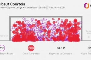 Opta指出,2018-2019赛季库尔图瓦加盟皇马以来,预期失球340.2粒,而去掉乌龙球的实际失球为288粒,这意味着库尔图瓦阻止了52.2粒失球,五大联赛门将同期最多。