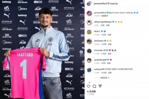 特拉福德晒出自己手持曼城1号球衣的签约亮相照,并配文:“回到了我所属的家。”