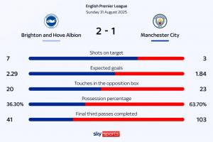 体育资讯08月31日讯 英超第3轮,曼城1-2遭布莱顿逆转,蓝月亮新赛季开赛3轮1胜2负仅积3分。