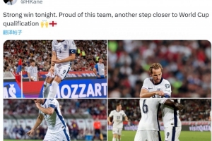 凯恩社媒晒出比赛照片,配文:“今晚大获全胜,为球队感到骄傲,距离晋级世界杯又近了一步。”