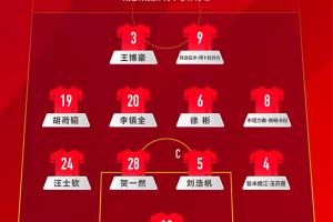 U22国足首发:12-霍深坪、19-胡荷韬、4-吾米提江、5-刘浩帆、24-汪士钦、28-贺一然、3-王博豪、6-徐彬、20-李镇全、8-木塔力甫、9-拜合拉木